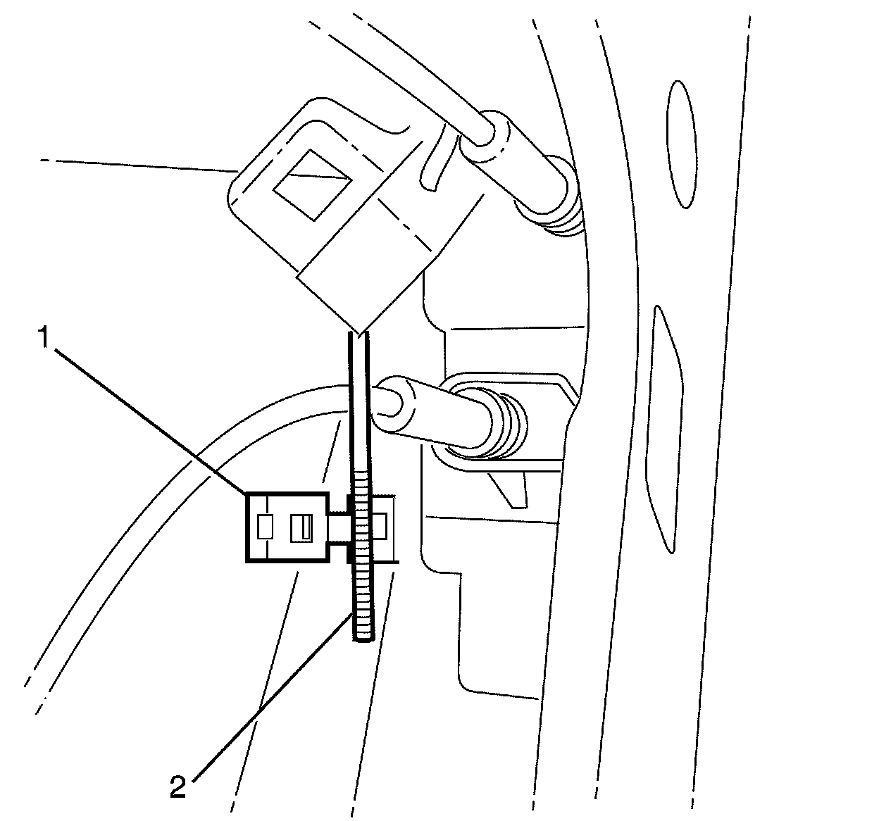 7. Install the lock actuating rod (1) to the lock cylinder retaining clip (2) (if fitted).
