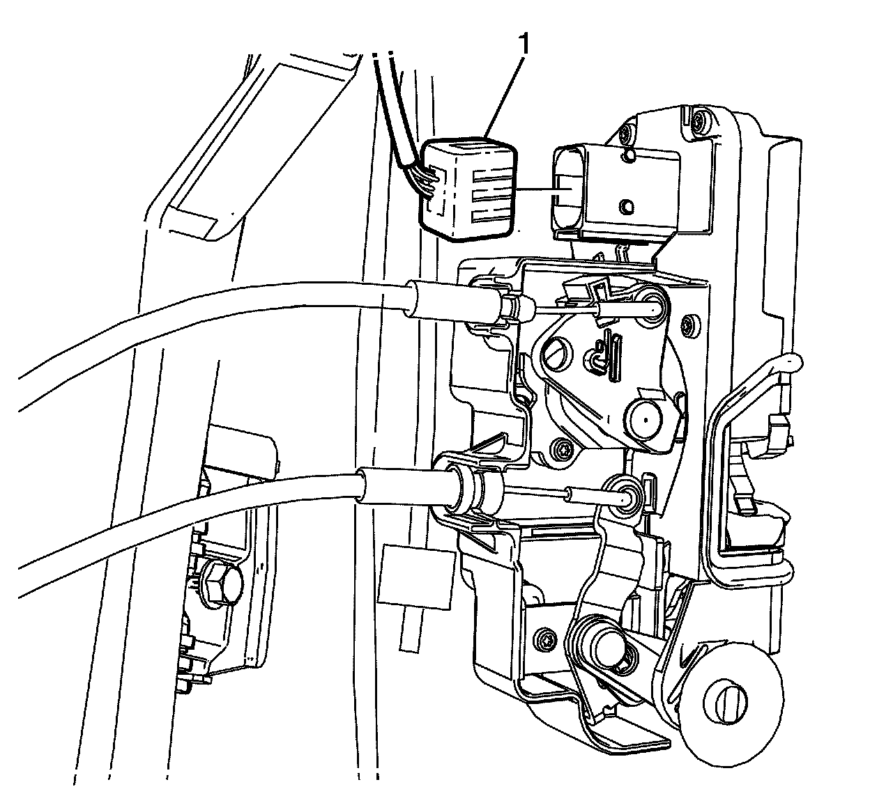2. Connect the inside door handle cable and inside door lock cable to the door latch. Refer to Front Side Door Inside Handle Cable Replacement (Service and Repair) .