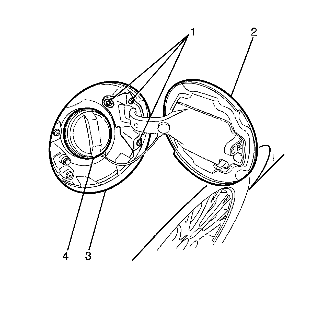 3. Remove the fuel tank filler door (2) from the rear quarter panel (3).