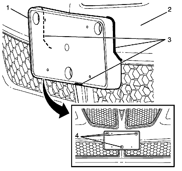 Important: If the front fascia (2) has been replaced, the licence plate mounting holes will require re-drilling, using a suitable tool.