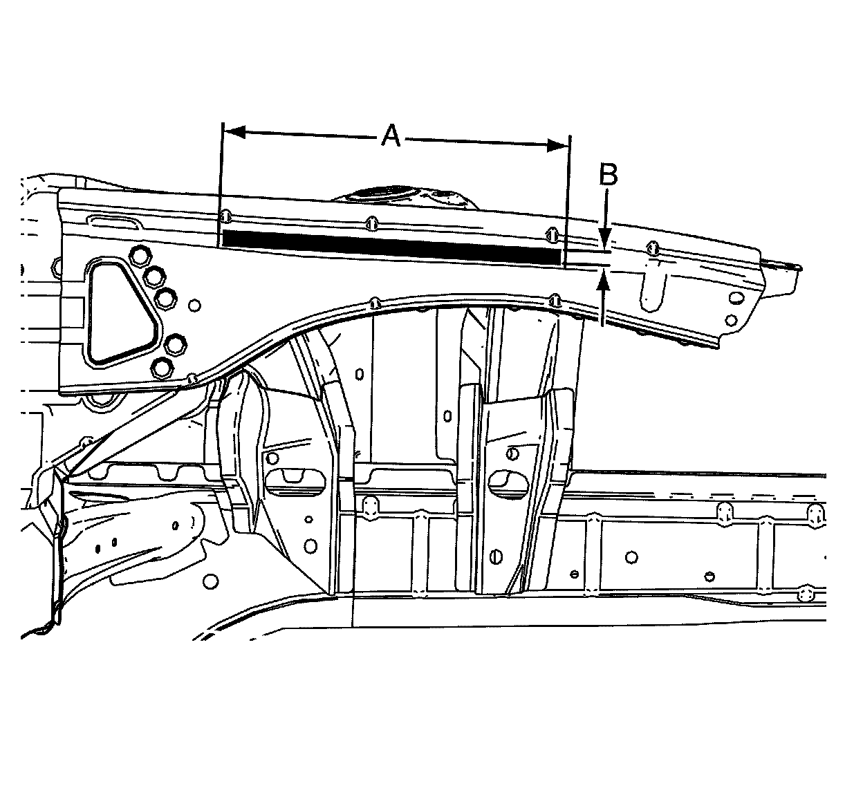 1. Apply an even amount of urethane GMW3041 or equivalent (Between the second and fourth swage (A) and 25 mm wide (B) of the upper wheelhouse brace).