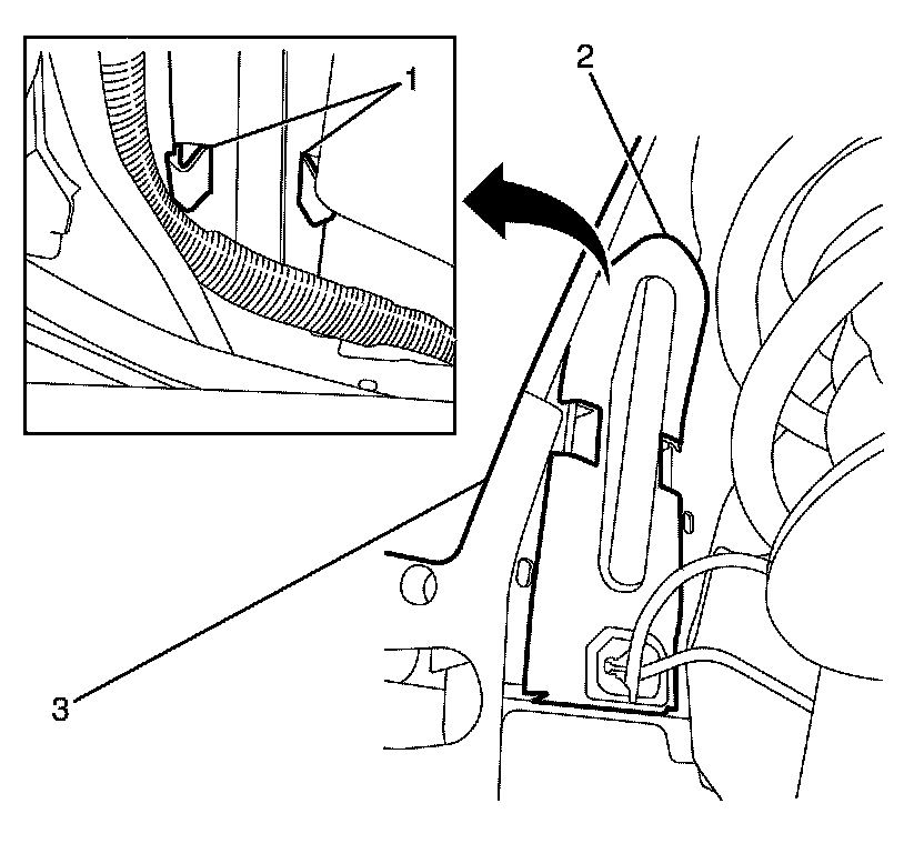 Important:Depress the splash guard clips (1) to disengage the splash guard (2) from the wheel house (3).