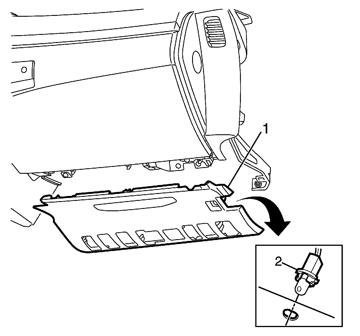 2. Remove the courtesy lamp socket assembly (2) from the instrument panel insulator by turning the socket counter-clockwise.