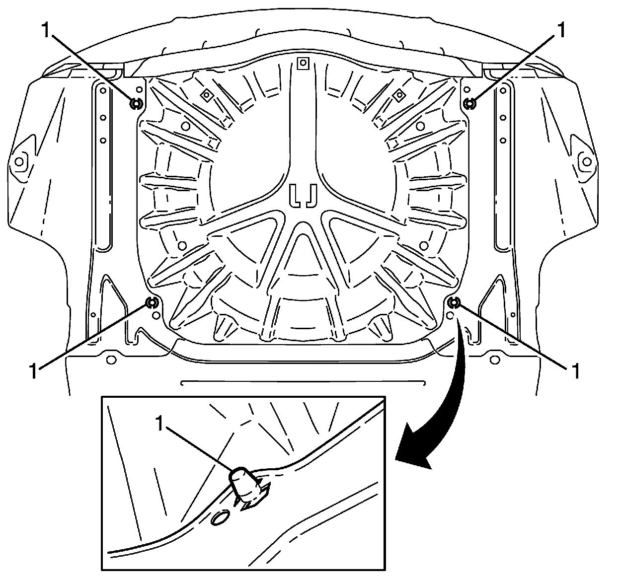 Important:Make sure that the spare wheel carrier panel datum pins (1) are correctly located in the rear compartment panels.
