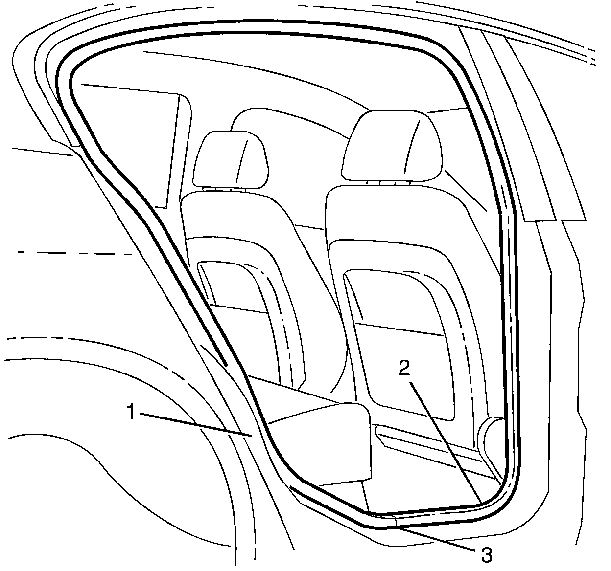 2. Starting from the centre sill point (2) carefully install the rear door weatherstrip (3) onto the body panel seam in the door opening (1).