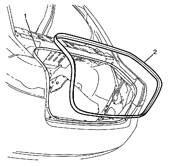 3. Make sure that the rear compartment weatherstrip (2) is secured properly to the entire pinch-weld flange (1).
