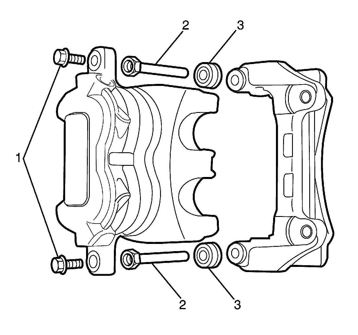 12. Inspect the brake caliper guide pins (2) for a smooth operation. Gently pull the brake caliper guide pins (2) outward without disengaging the guide from the brake caliper boots (3). Push the brake caliper guide pins (2) inward, and inspect for the following: