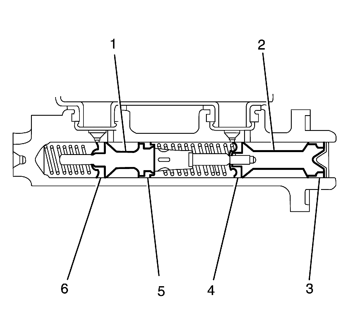 7. If the master cylinder primary piston (2) does not exhibit any leakage, pressure bleed the brake system. Refer to Hydraulic Brake System Bleeding (Manual) (Service and Repair)Hydraulic Brake System Bleeding (Pressure) (Service and Repair) .