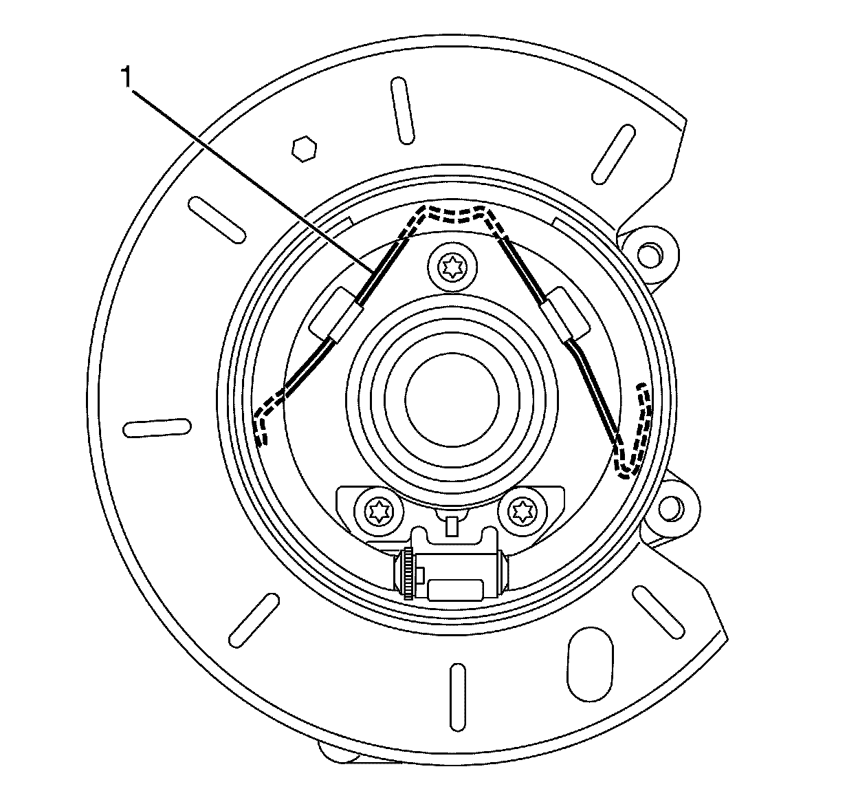7. Remove the park brake shoe retaining spring (1).