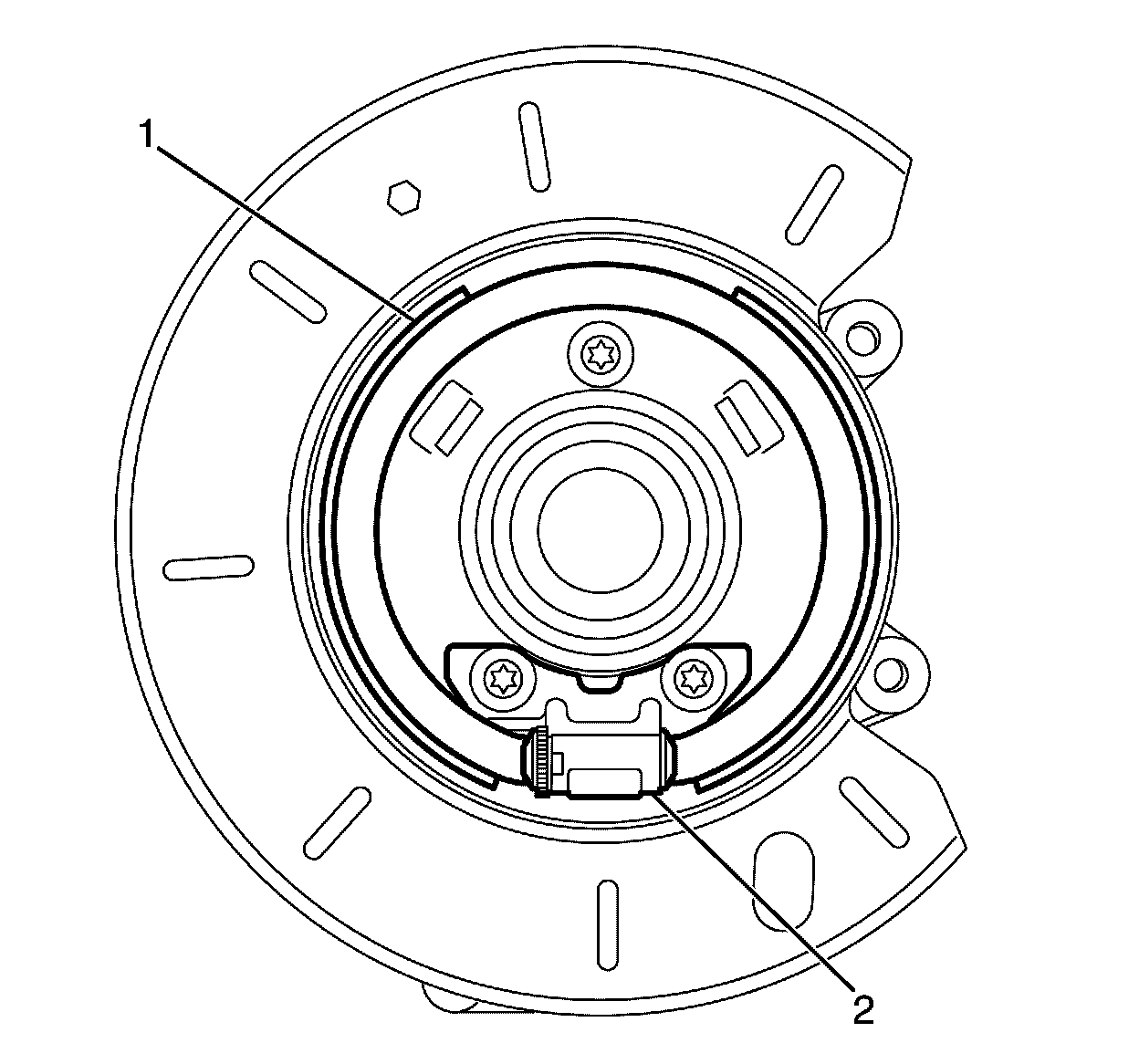 Important: Attach the park brake shoe assembly (1) to the actuator assembly (2) by grasping the park brake shoe assembly (1) and spreading slightly while pulling the shoe over the actuator assembly (2).