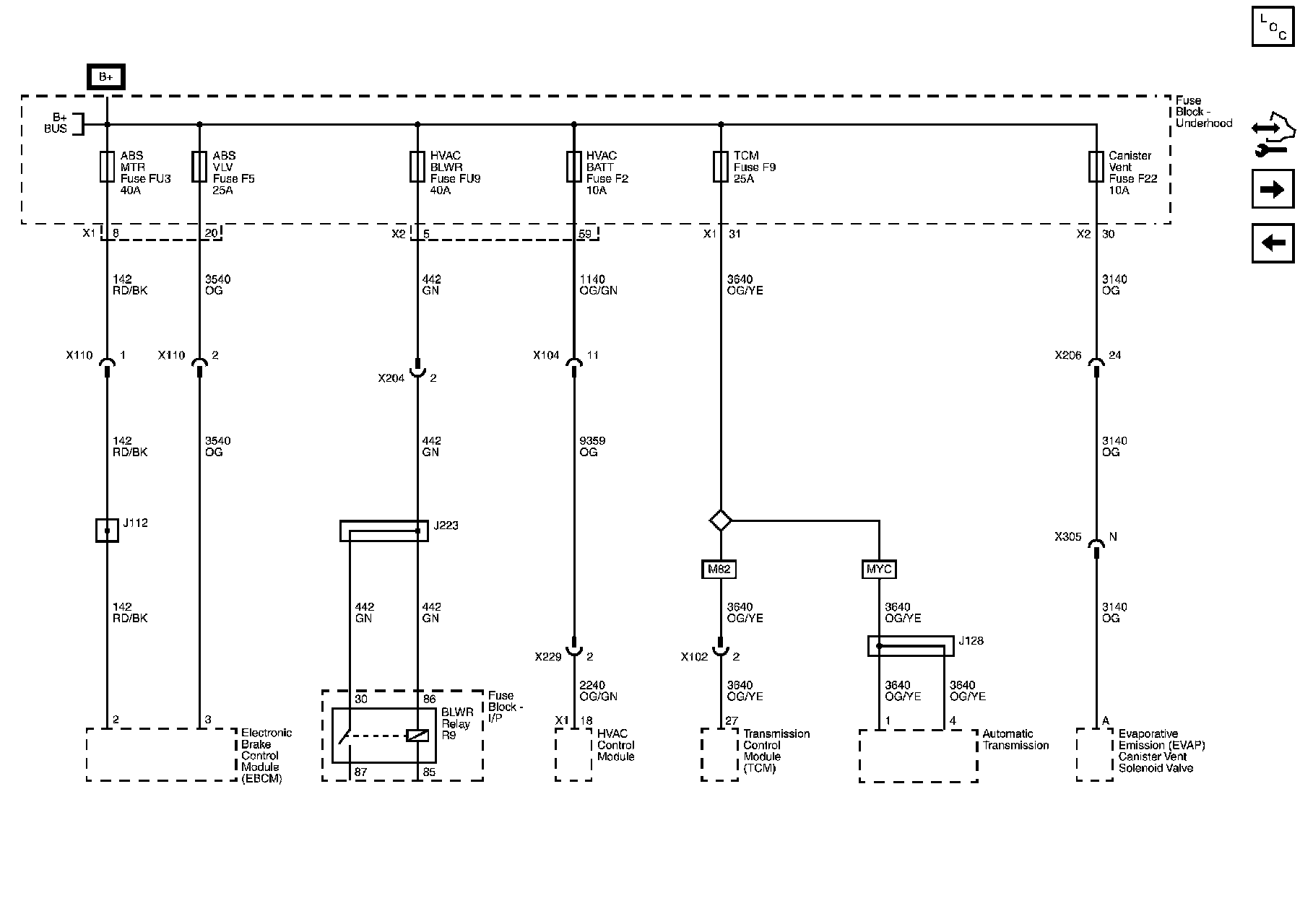 ABS MTR, ABS VLV, CANISTER VENT, HVAC BATT, HVAC BLWR, and TCM Fuses