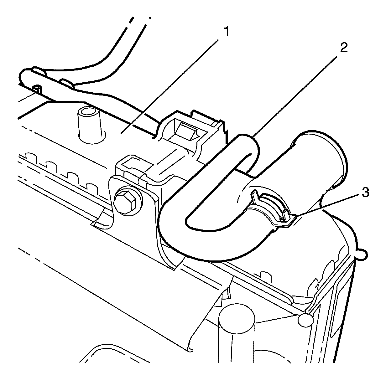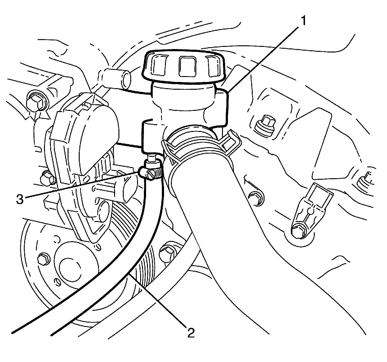 3. Install the coolant air bleed hose (2) onto the outlet housing (1) and secure with hose clamp (3).
