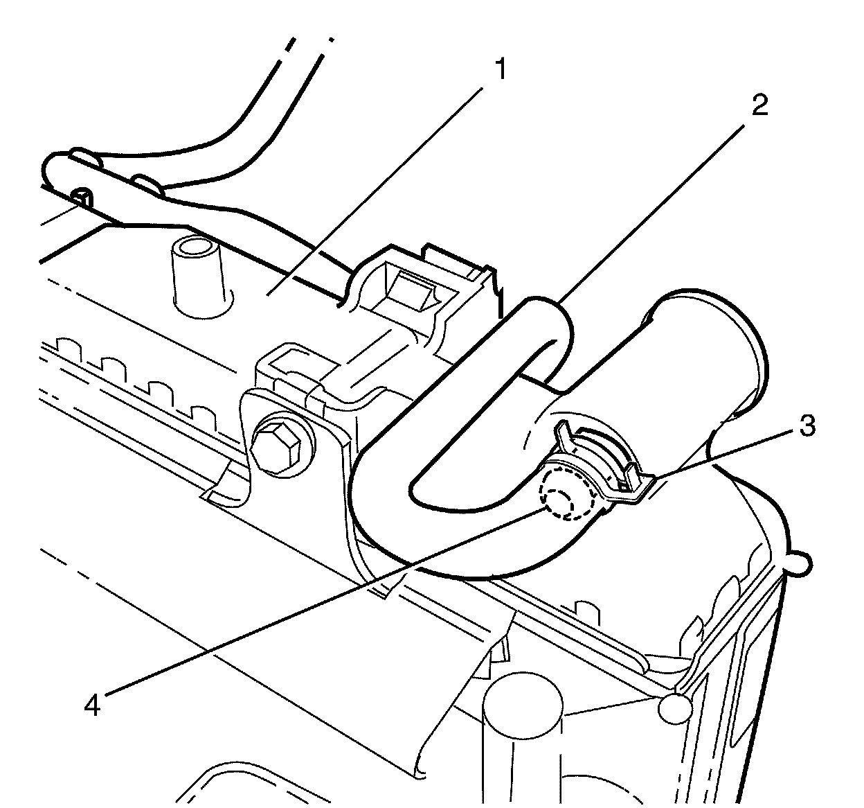 1. Install the air bleed hose (2) onto the radiator (1) spigot (4) and secure with the coolant air bleed hose clamp (3).