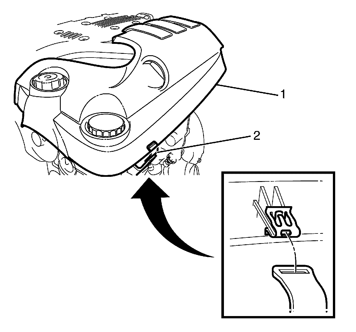 Important: Grasp and pry the engine covers (1) upwards to detach the engine covers (1) from the outer retaining clips (2).