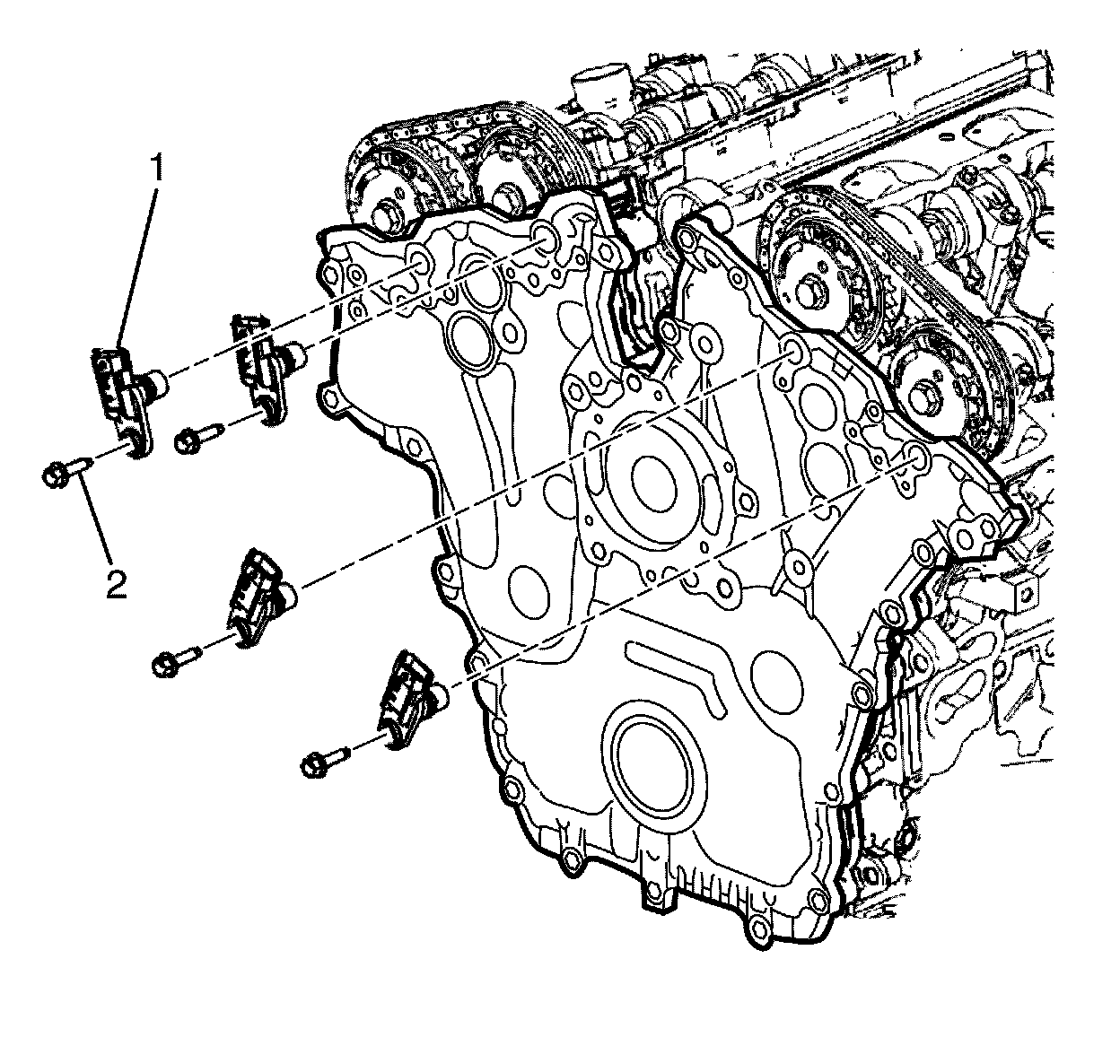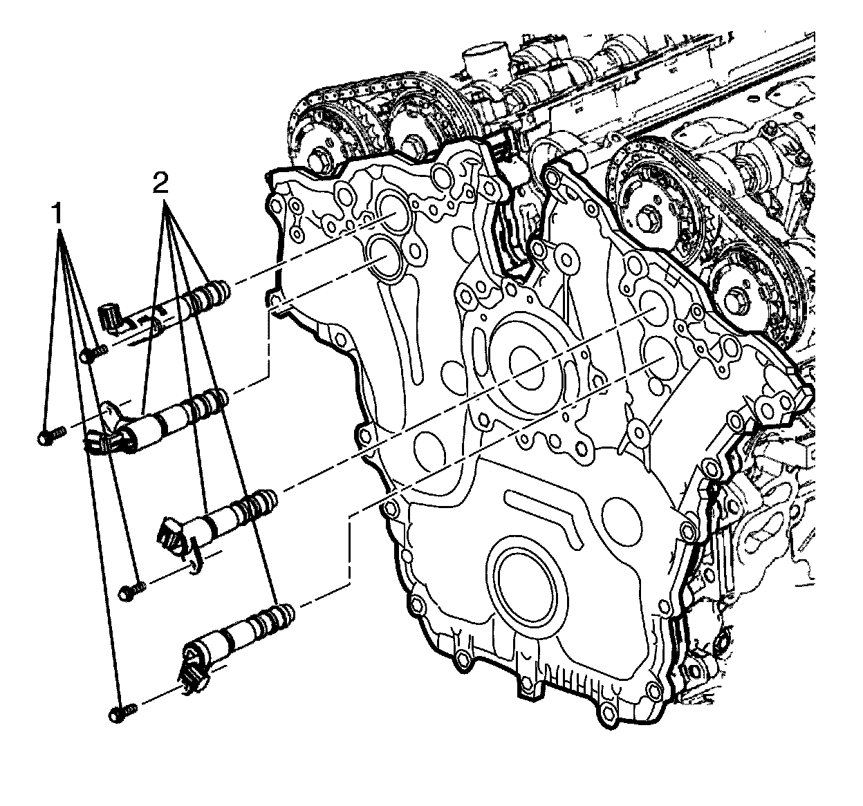 12. Install the camshaft position actuator solenoid to front cover retaining bolts (1).