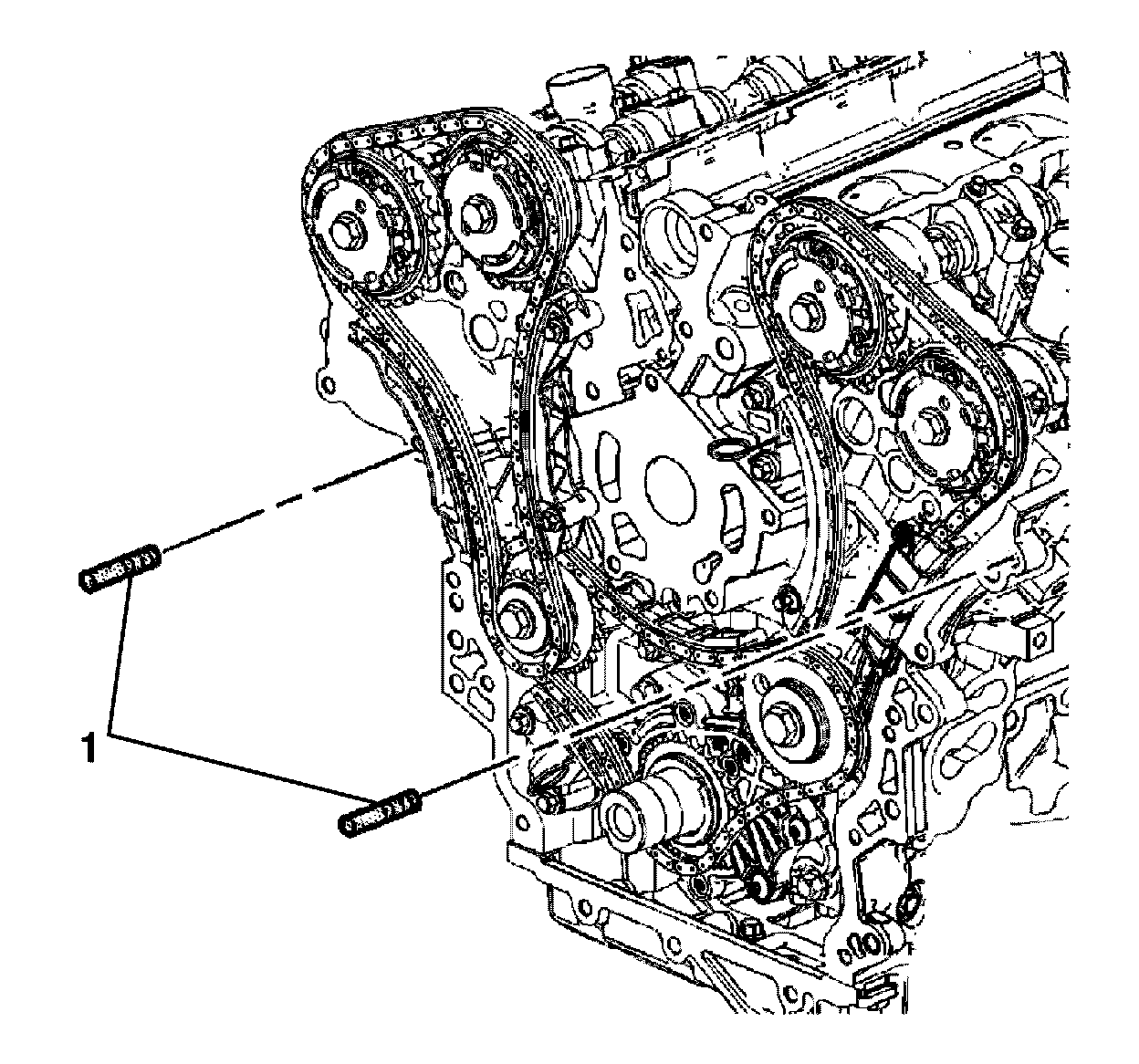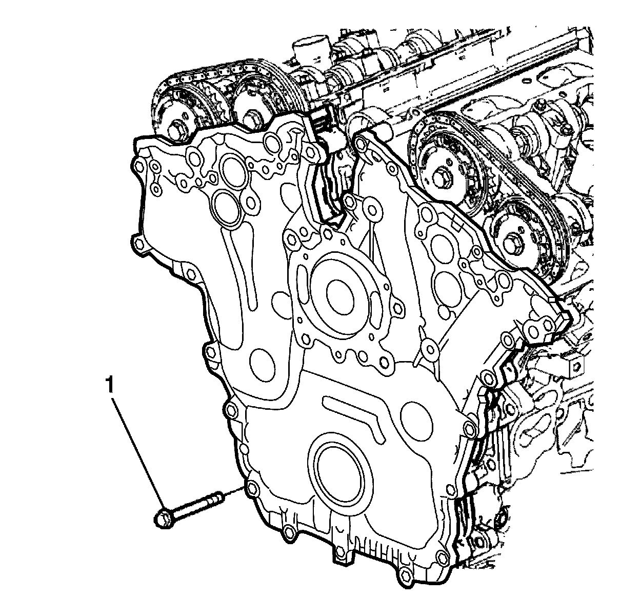 6. Hand start all the engine front cover to cylinder block retaining bolts (1).