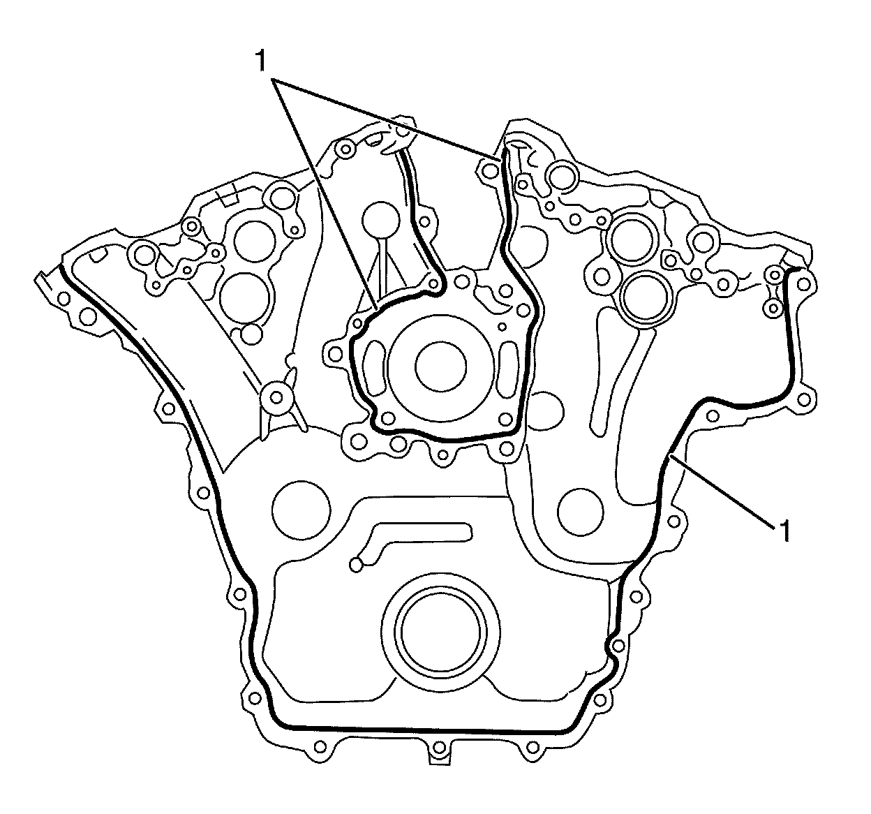 3. Place a 3 mm (0.118 in) bead of RTV sealant (1), on the engine front cover as shown.
