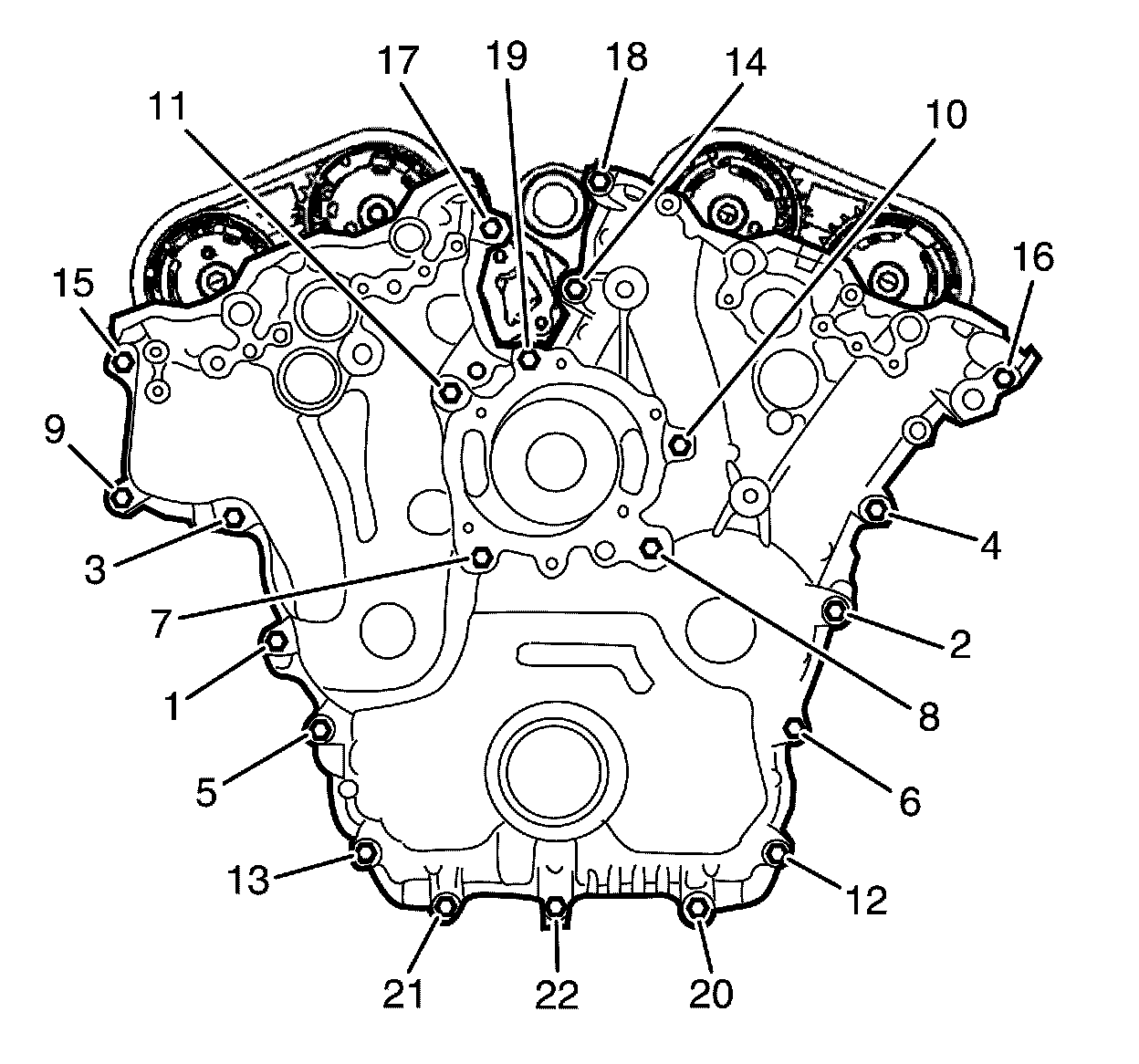 7. Tighten the engine front cover to cylinder block retaining bolts in the sequence shown.