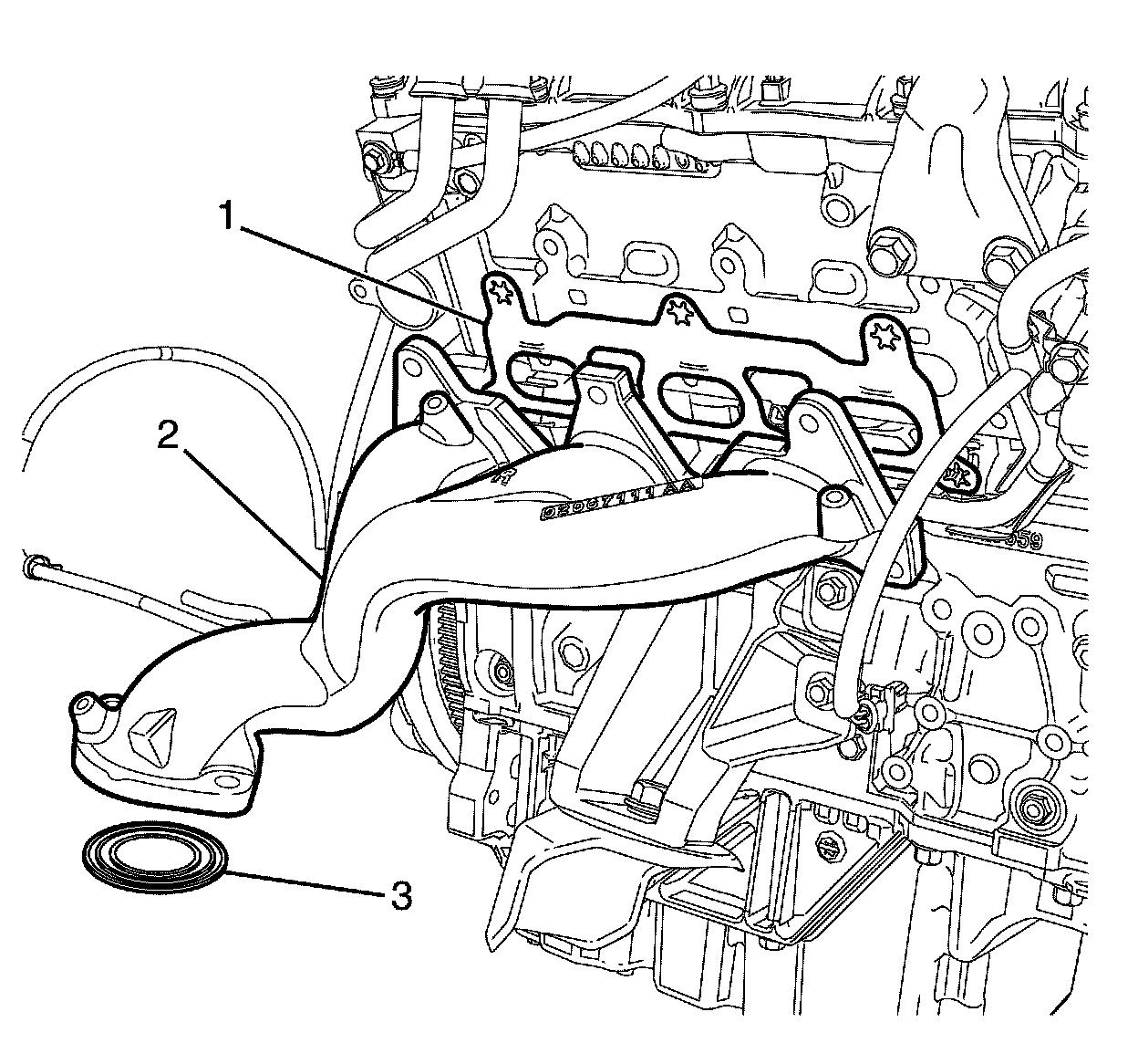 1. Install a NEW exhaust manifold gasket (1) and NEW sealing ring (3) to the exhaust manifold (2).