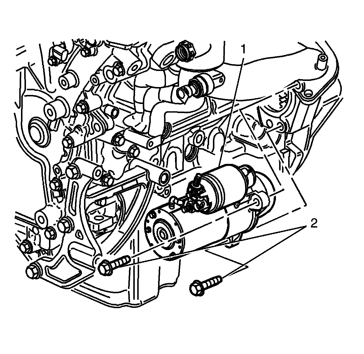Install the starter motor to cylinder block retaining bolts (2).