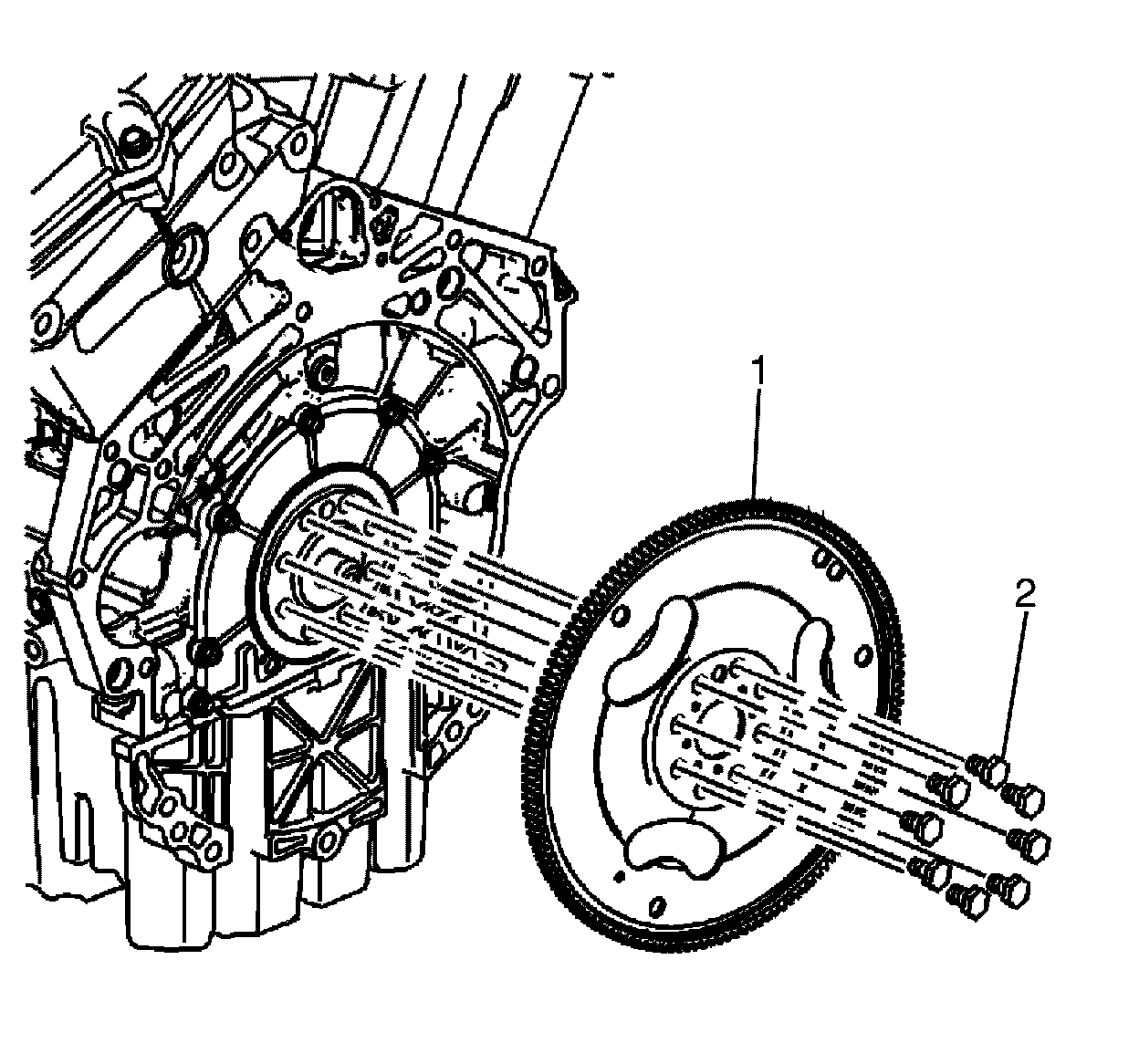 3. Install 2 NEW automatic transmission flex plate to crankshaft retaining bolts (1) in location at the top and bottom of the automatic transmission flex plate (2) bolt pattern allowing the automatic transmission flex plate (2) to hang in position.