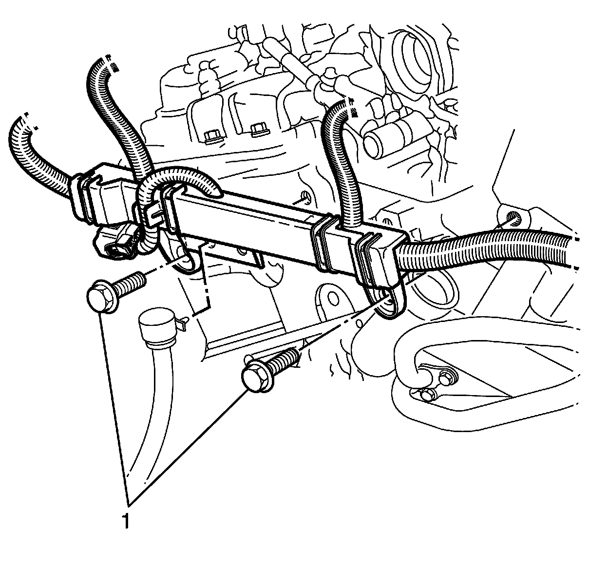 26. Remove the engine wiring harness bracket to cylinder head retaining bolts (1).