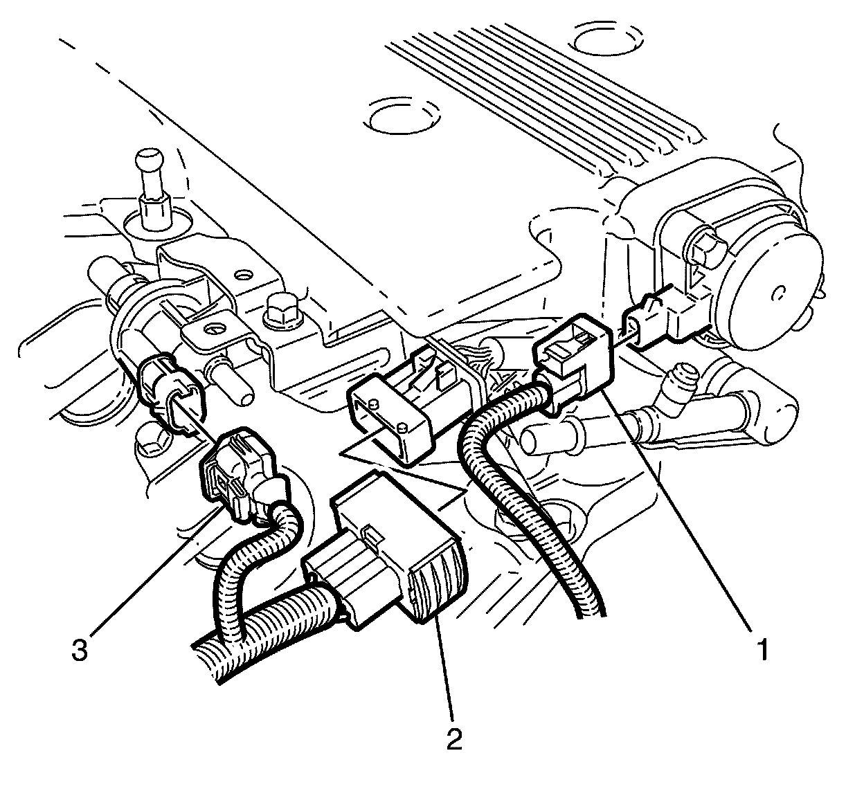 52. Detach the engine wiring harness bracket (2) from the left bank camshaft cover (3).