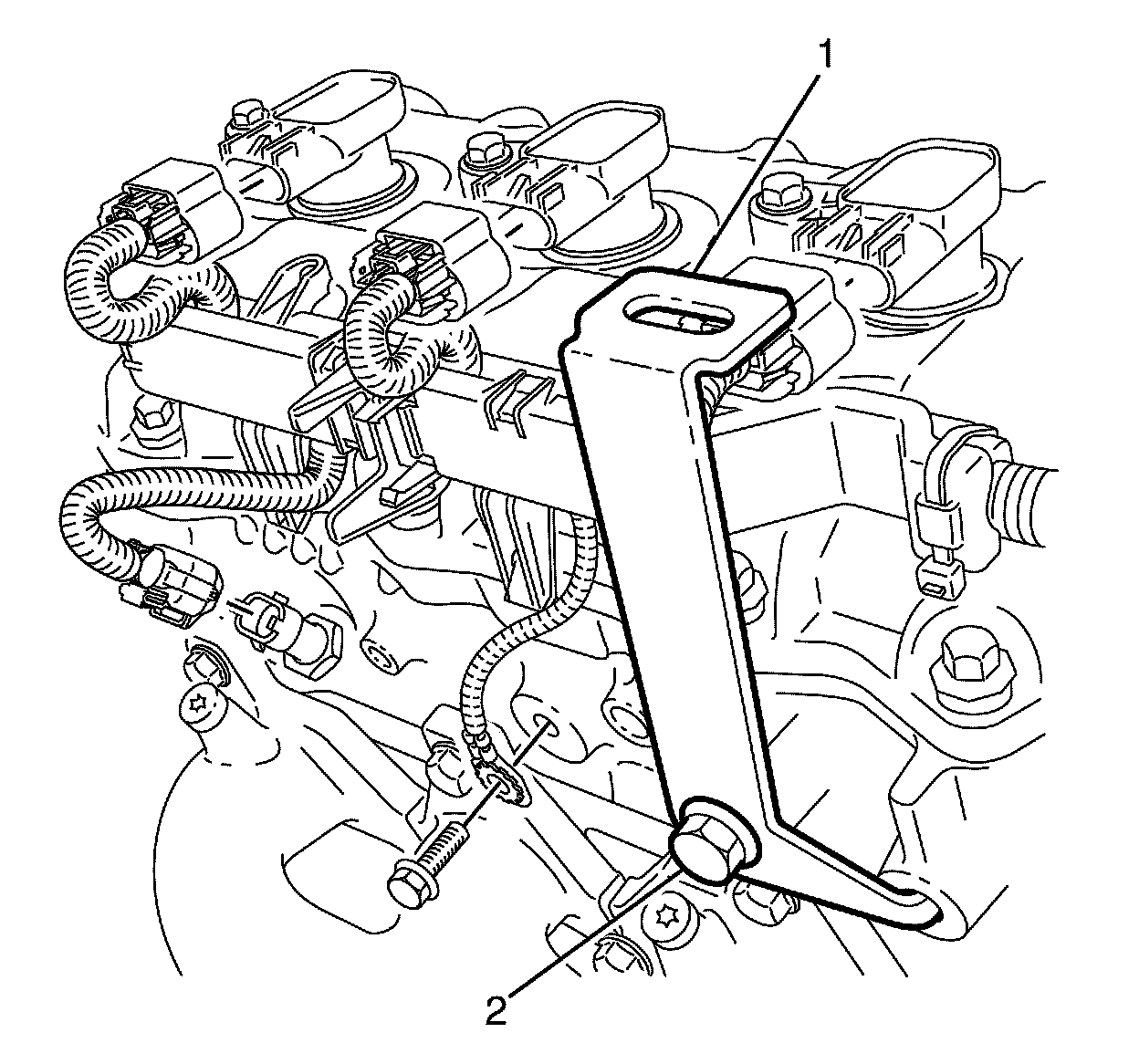7. Remove the engine wiring harness bracket to right bank cylinder head retaining bolt (2).