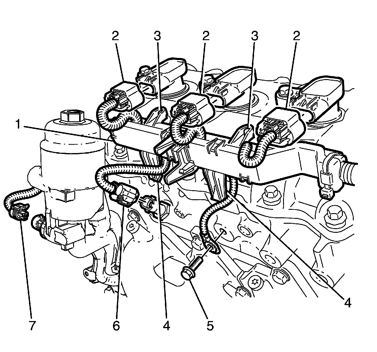 4. Detach the engine wiring harness to cylinder head retaining lug (3).