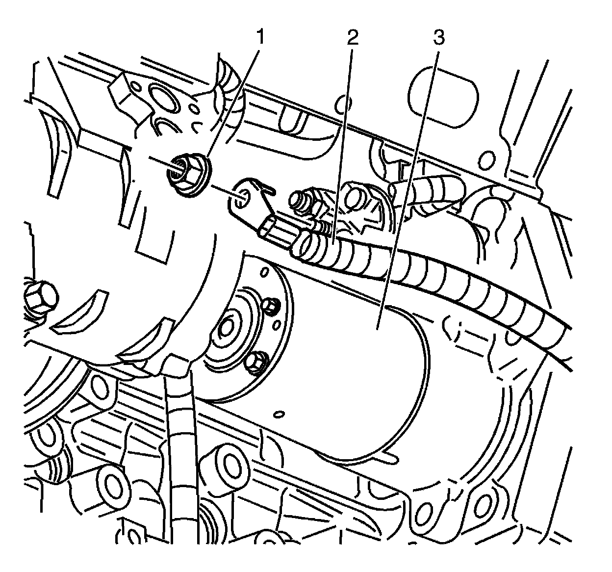 8. Remove the engine wiring harness bracket to cylinder block retaining bolt (3).