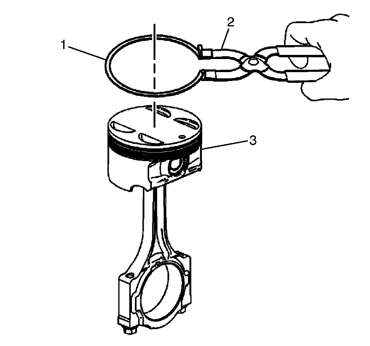 1. Remove the piston rings (2) from the piston (3) using a piston ring expander (1). Place each ring in a clean shop towel for storage.