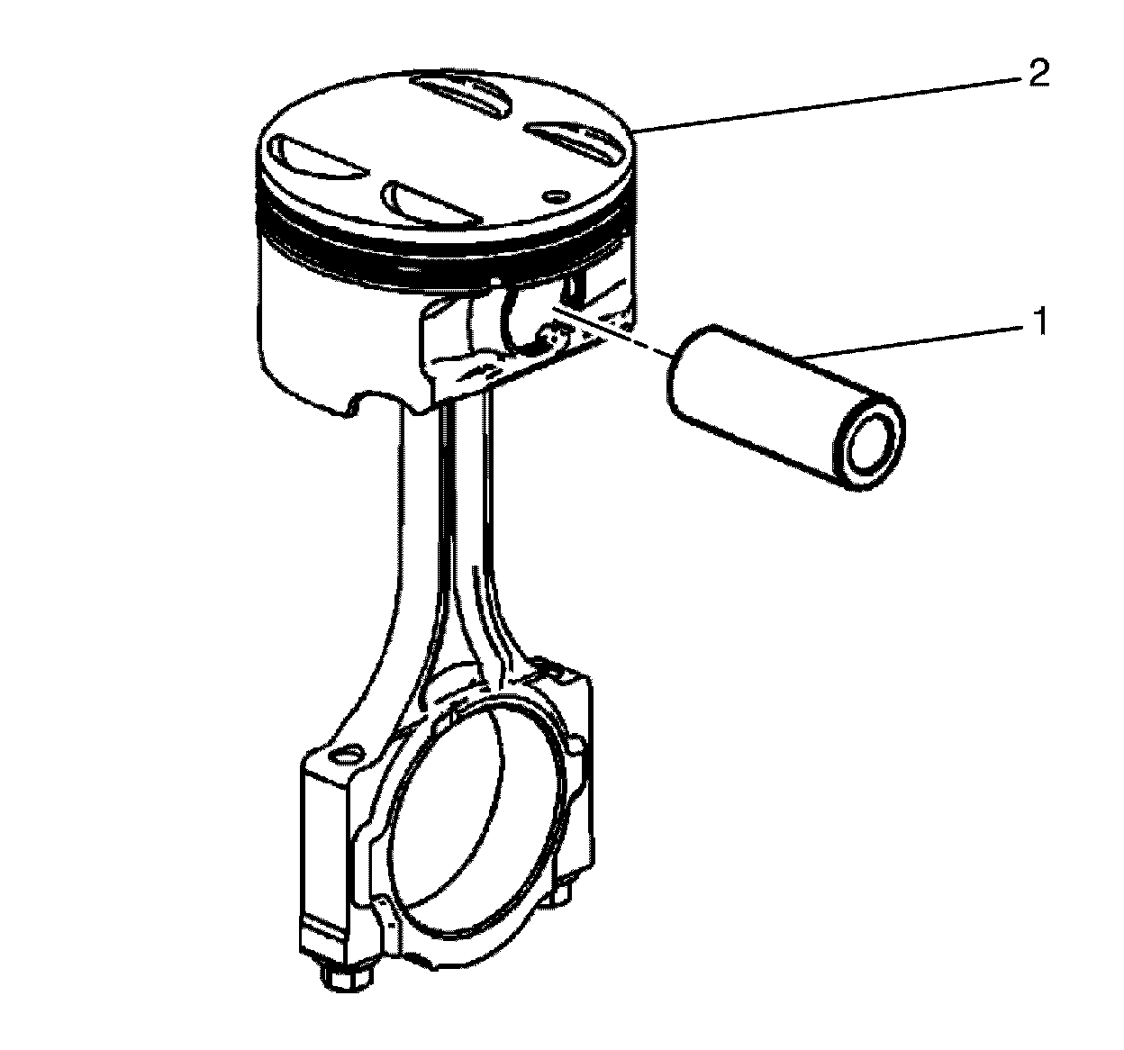 3. Slide the piston pin (1) out of the piston (2). The piston will disconnect from the connecting rod.