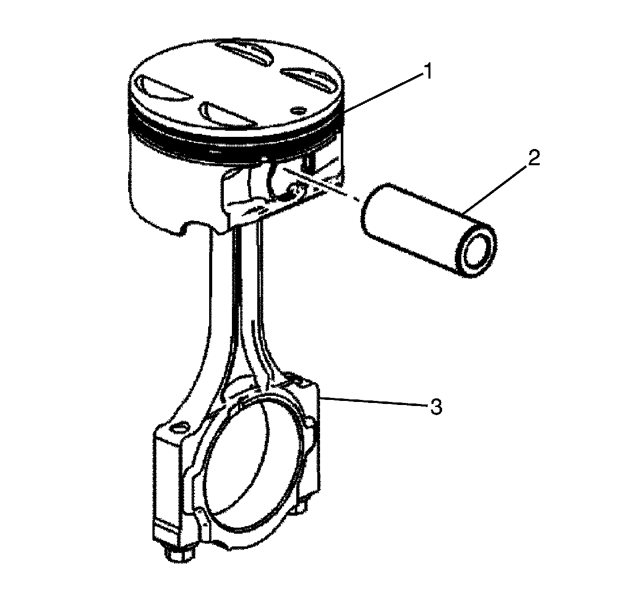2. Assemble the piston (1) and piston pin (2) to the connecting rod (3). Correctly orient the piston (1) when reusing a marked connecting rod (3).