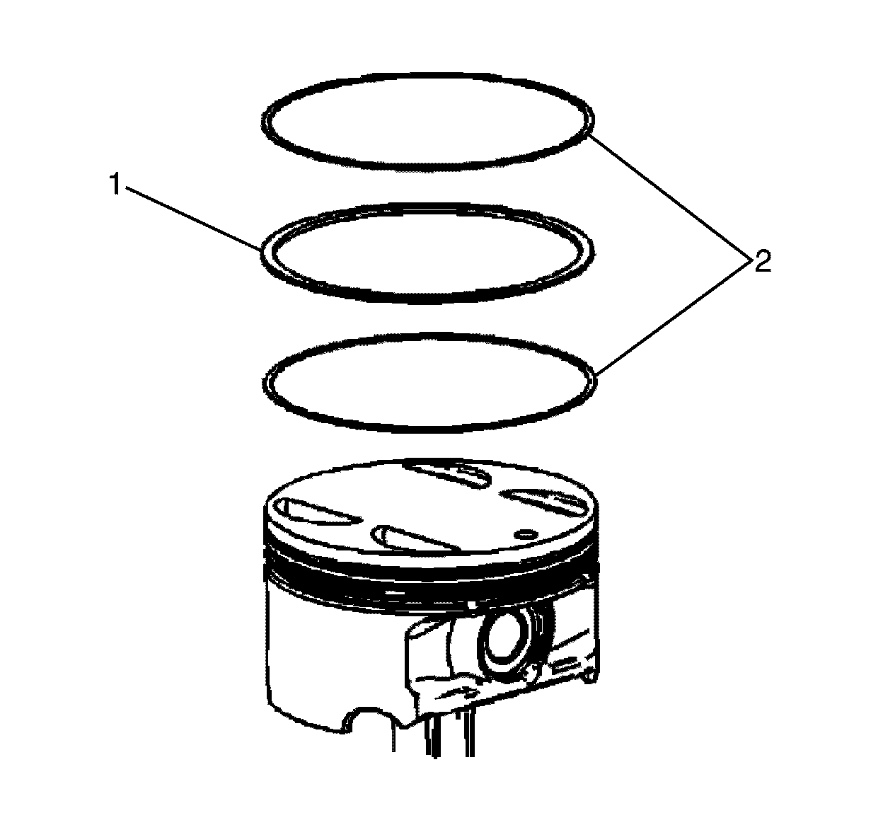 2. Install the 2 oil scraper rings (2). Expand the rings only enough to clear the piston diameter.