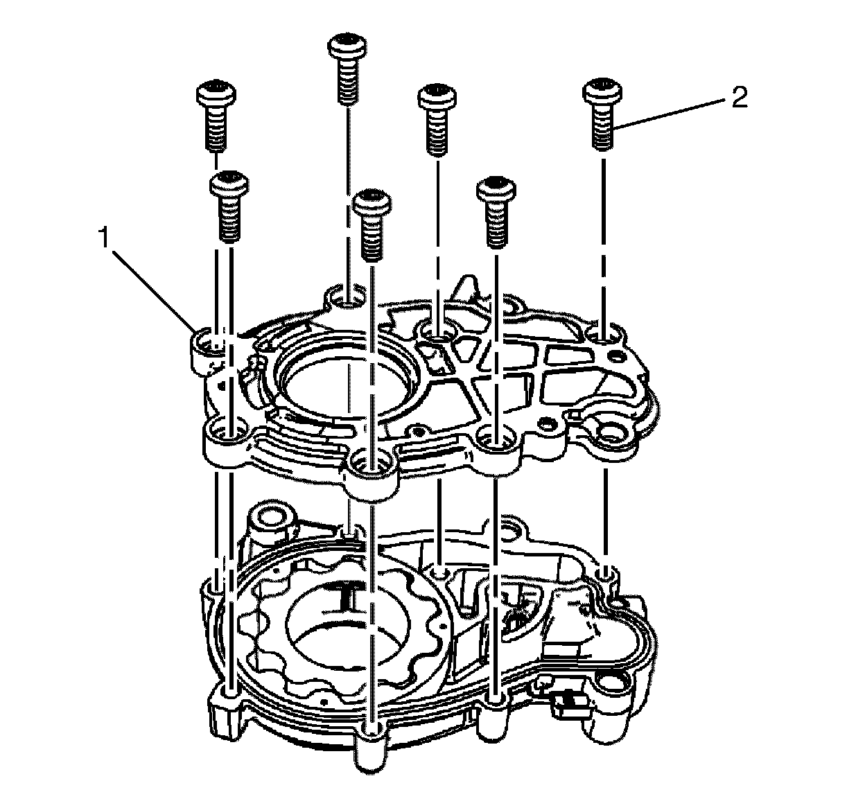 3. Remove the oil pump cover to the oil pump housing retaining bolts (2).