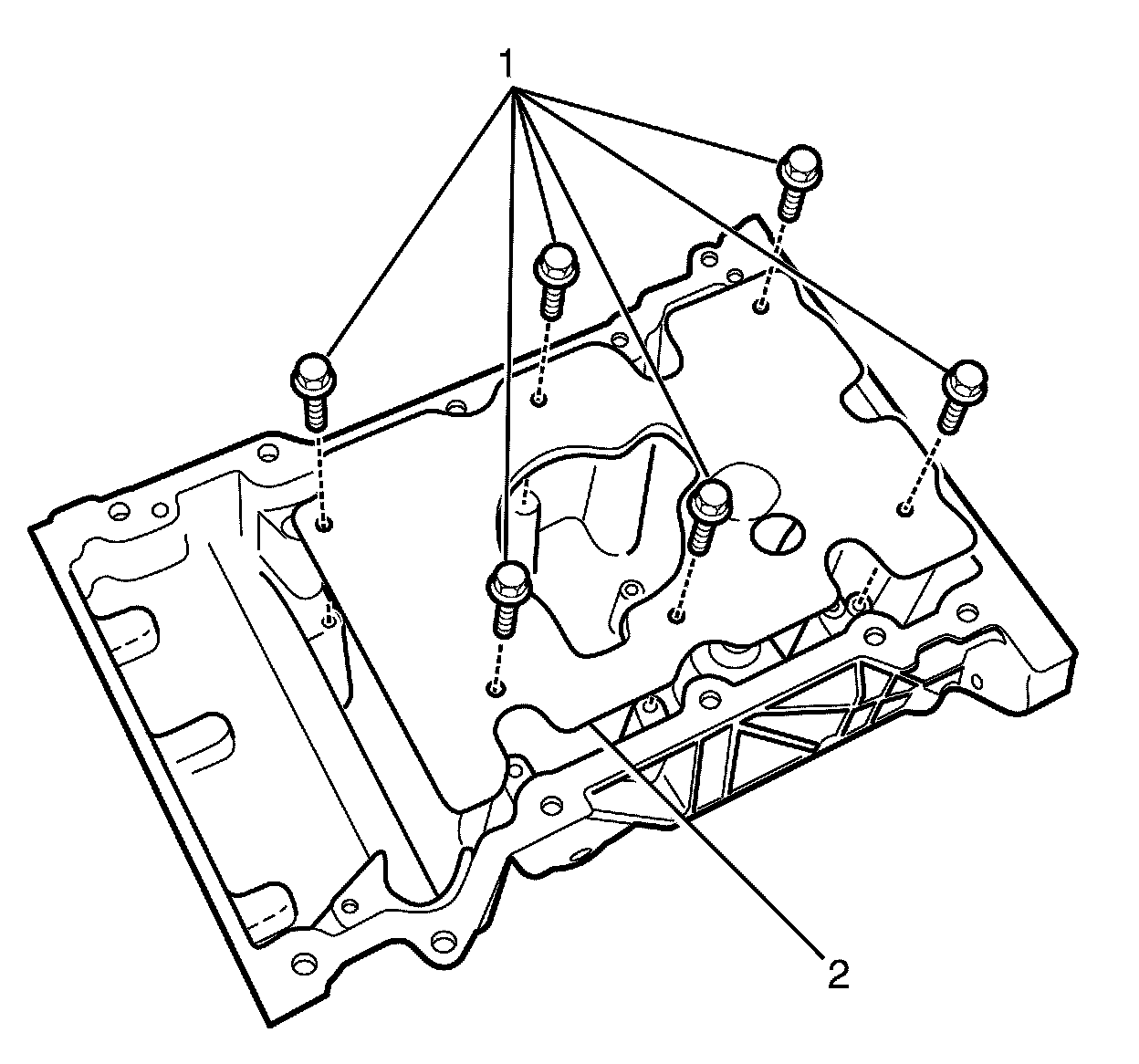 9. Remove the oil pan baffle to oil pan retaining bolts (1).