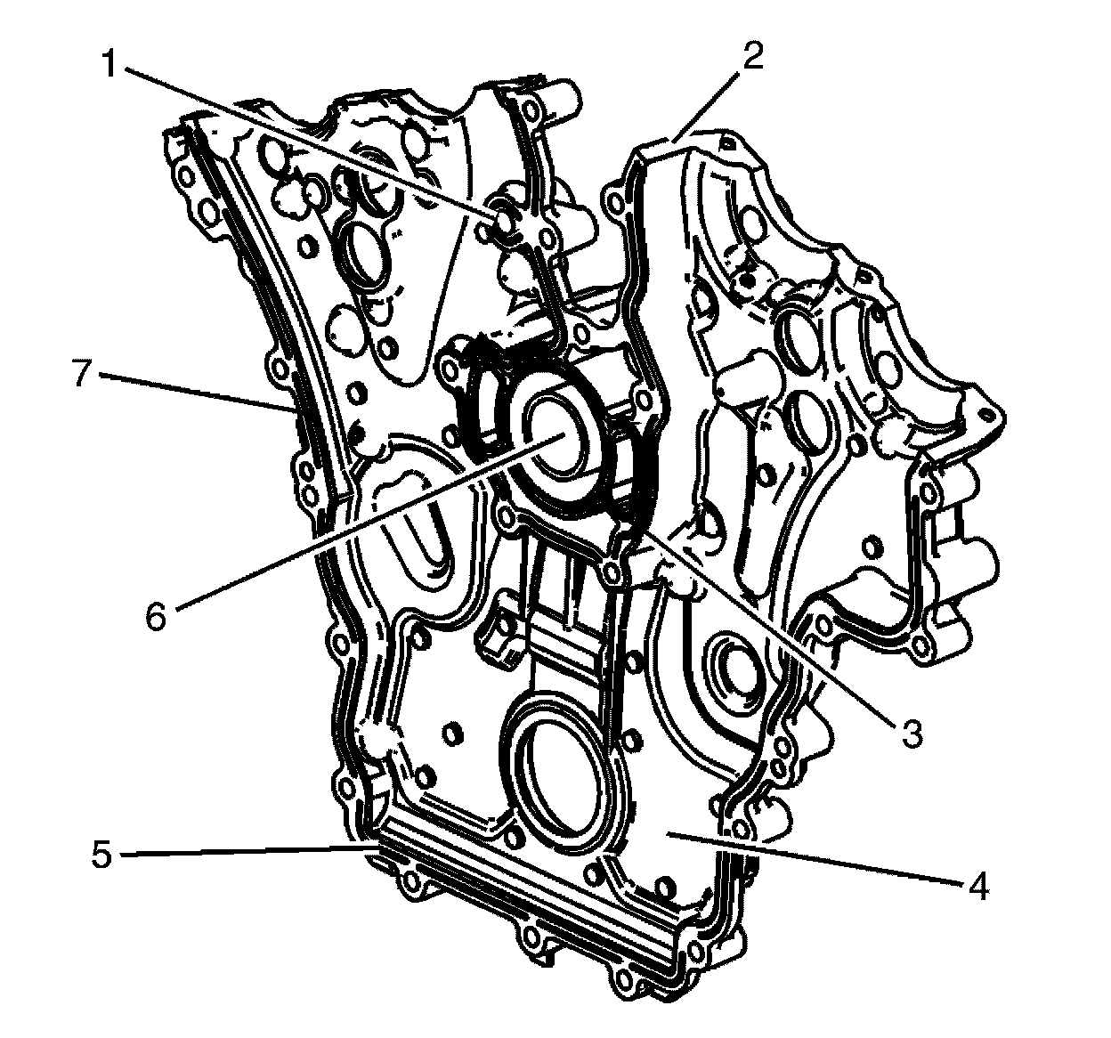 * Gouges or damage to the engine front cover sealing surfaces to the cylinder block (7), oil pan (5), and/or camshaft covers (2).