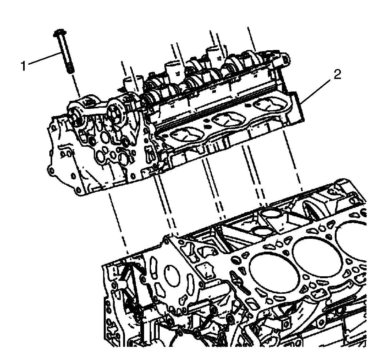 3. Align the right cylinder head (2) with the deck face locating pins.