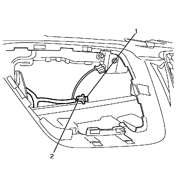 Important: Accessing the ambient temperature sensor (1) through the right front bumper fascia lower grille cavity, remove the ambient temperature sensor (1) by squeezing the locking tabs (2) and push free from the bracket.