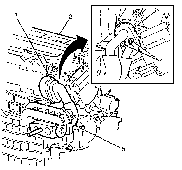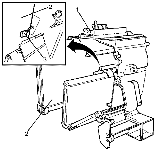 Important: DO NOT force the evaporator (2) into the HVAC module assembly (1). Damage to the evaporator temperature sensor (3) can occur.