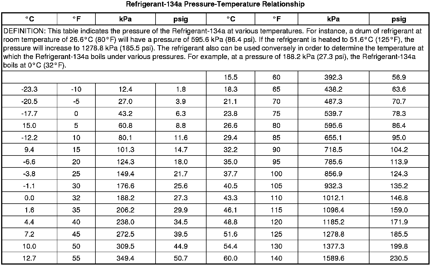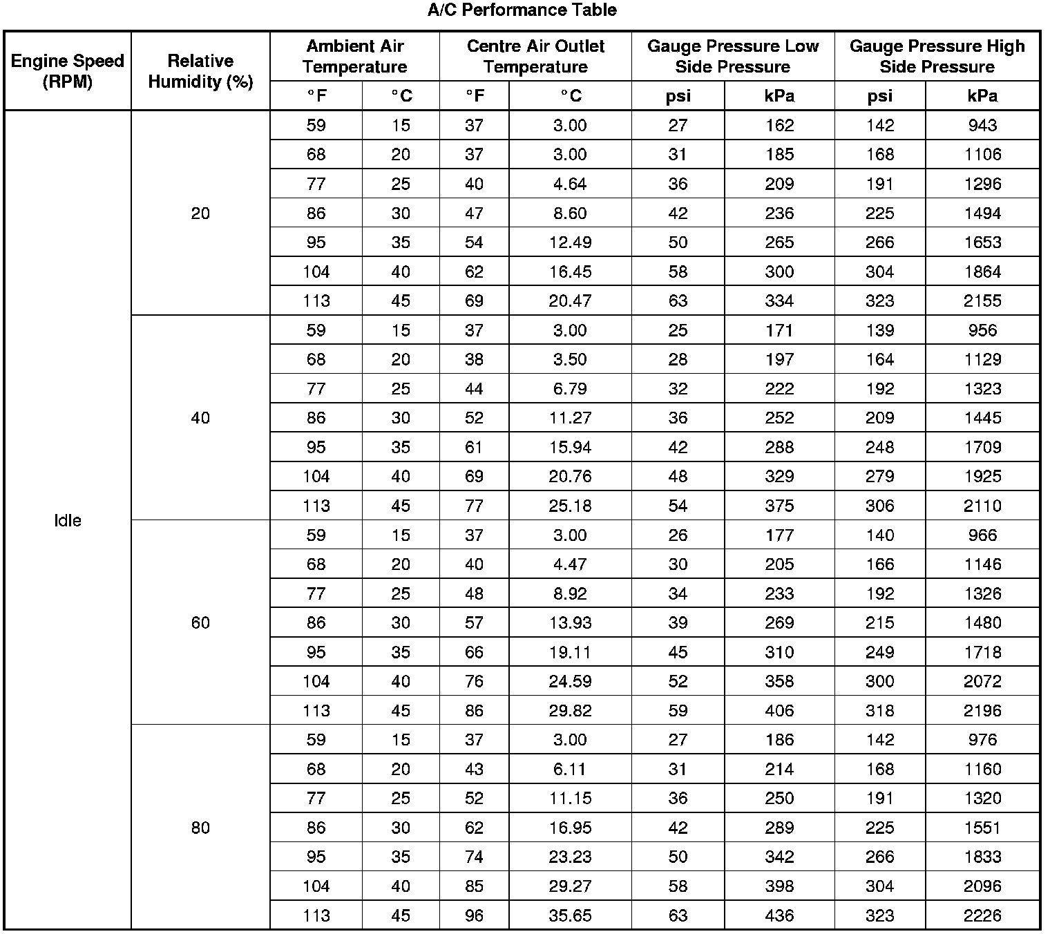 14. Turn the engine OFF and compare the readings with the data in the A/C performance table. A normally operating A/C system should not exceed levels shown. If the readings exceed the table limits, refer to Symptoms - HVAC Systems - Manual (Symptom Related Diagnostic Procedures) .