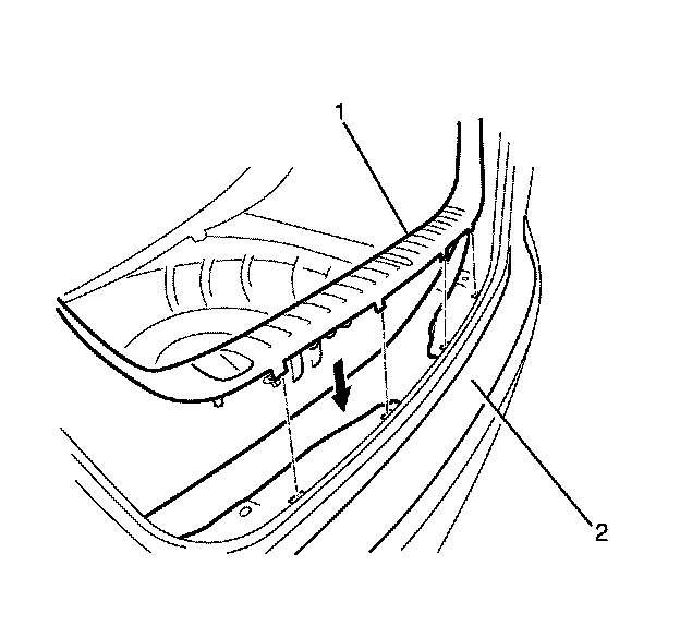 7. Install the end panel (1) to the vehicle (2) and listen for an audible click to confirm correct fitment.