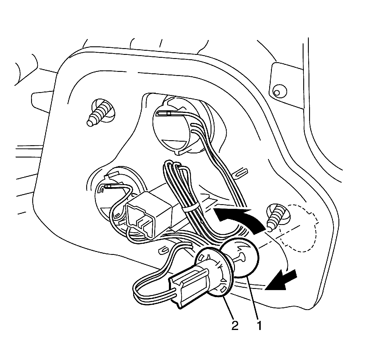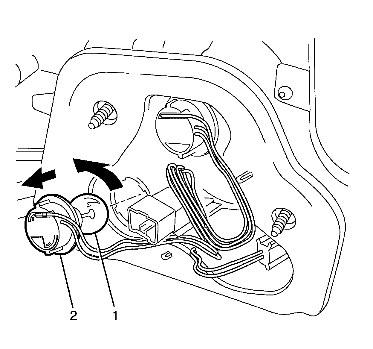 7. Remove the backup light bulb (1) and socket (2) from the rear lamp assembly by pushing and rotating the bulb counter-clockwise.