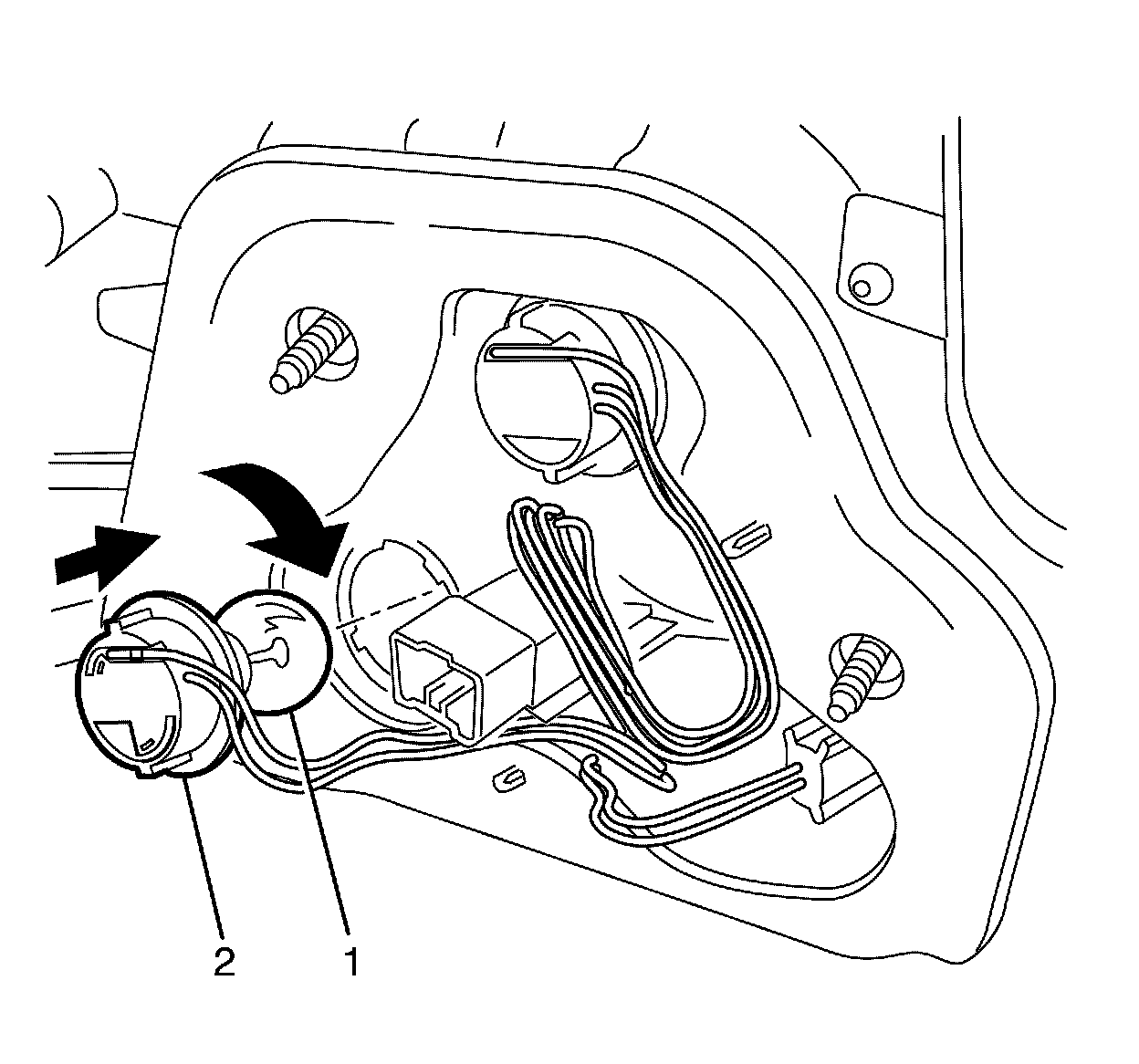 1. Install the new stop/tail lamp bulb (1) into the socket (2) by pushing and rotating the bulb clockwise.