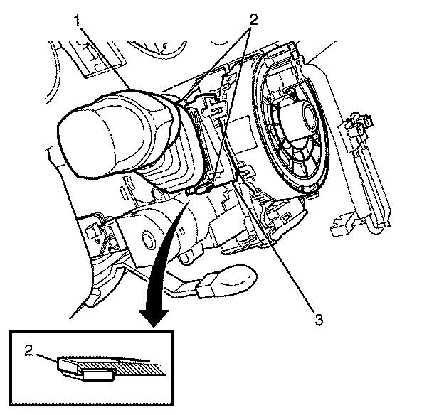 Important: Press the retaining tabs (2) on the turn signal switch (1) and pull the turn signal switch assembly away from the steering column (3).