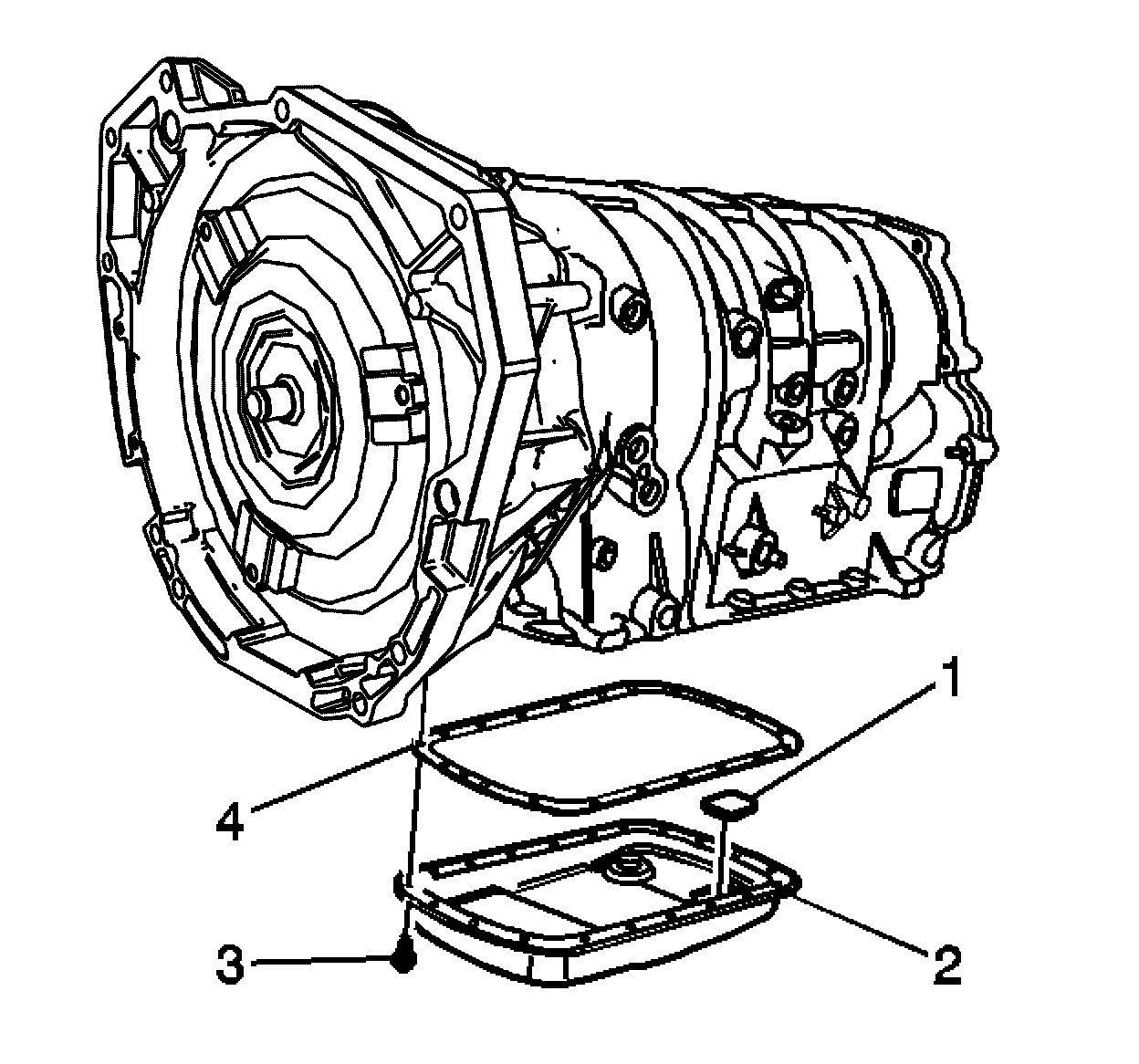 8. Remove the fluid pan (2) and the gasket (4).