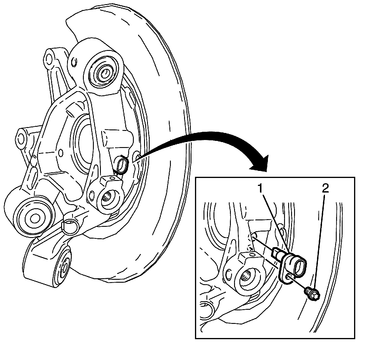 3. Remove the wheel speed sensor to knuckle retaining bolt (2).