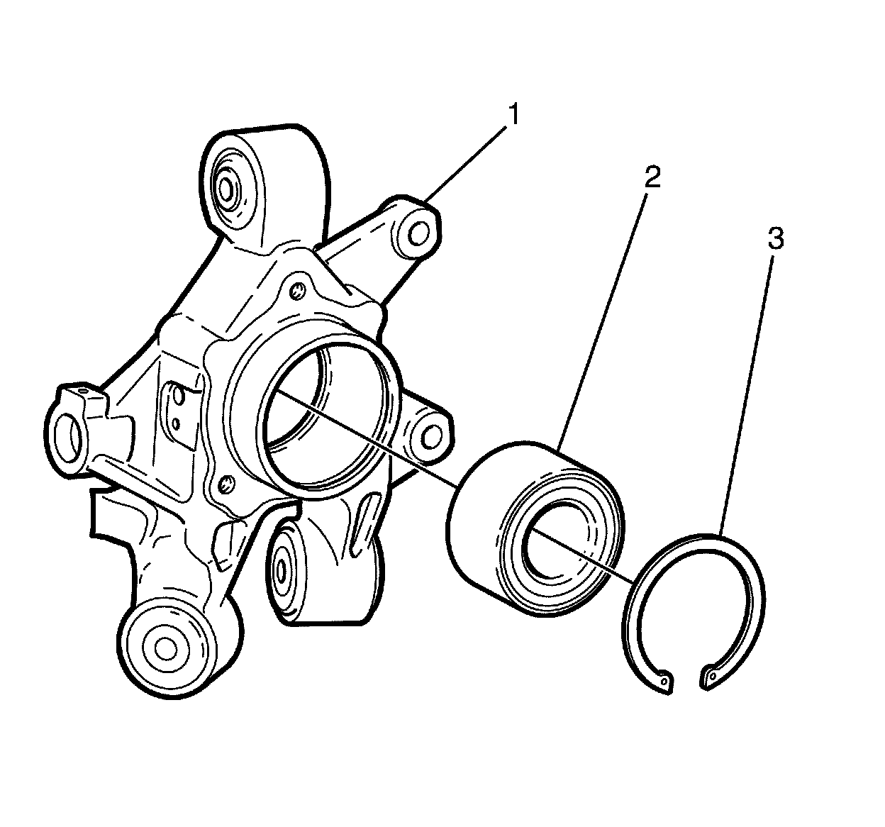 2. Install the wheel bearing retaining circlip (3) using suitable circlip pliers.