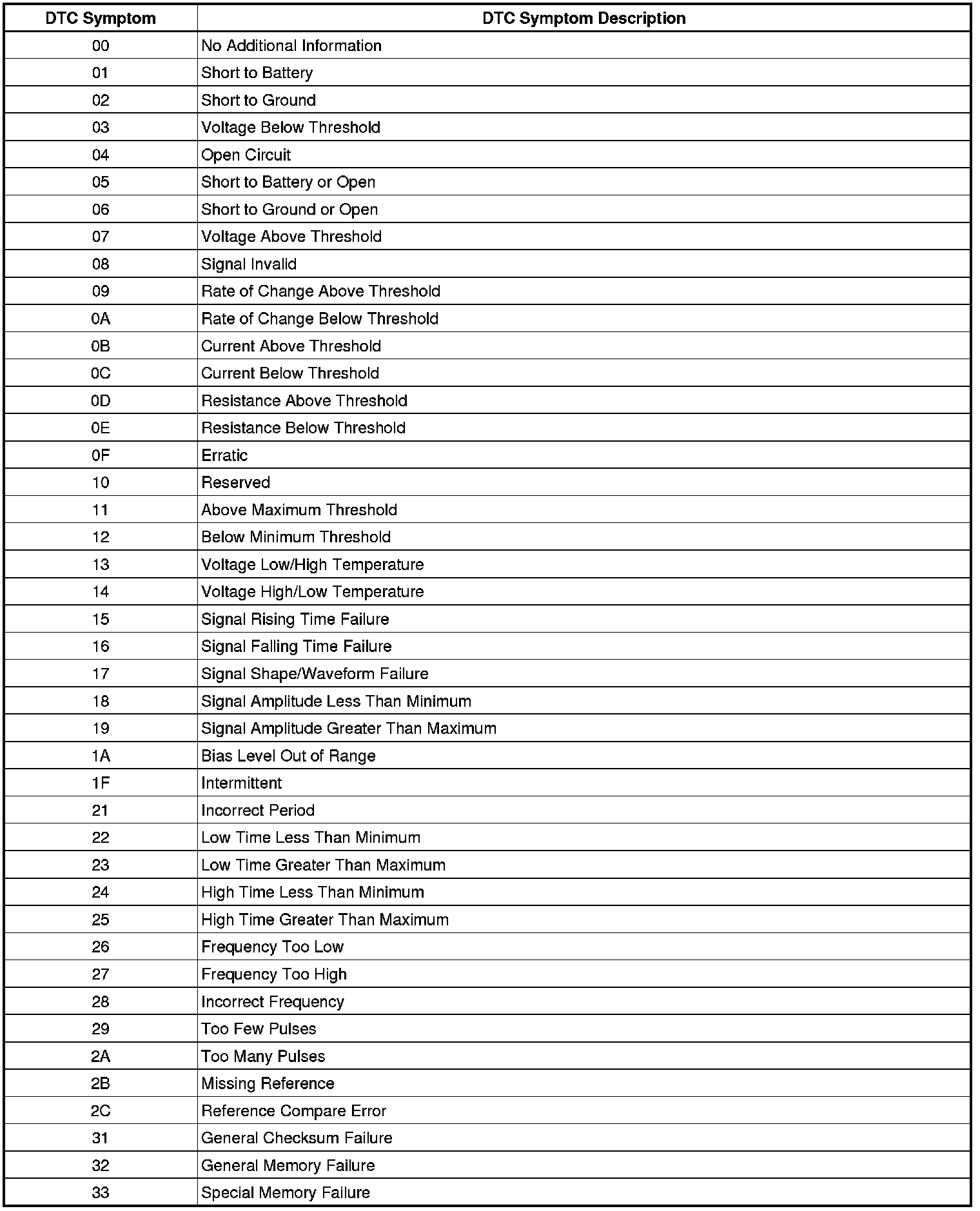 The DTC symptom is made up of 2 alphanumeric digits. The first digit following the DTC indicates the DTC symptom category. There are 16 possible categories available in the range of 0 through the letter F. Currently there are 8 categories in use, 0 through 7. These 8 categories together with their definitions are given below.