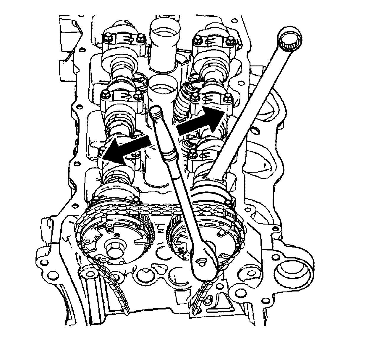 17. Use an open-end wrench on the hex cast into the right intake and exhaust camshafts and rotate the camshafts towards each other in order create slack in the chain between the actuators.